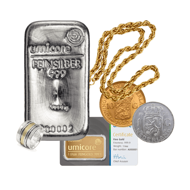 Jouw (oude) goud en zilver verkoop je bij Goudzaken eenvoudig online. Je ontvangt bij ons altijd eerlijke en goede prijzen, we hebben een overzichtelijk proces voor je ingericht en we betalen je na controle direct uit. Je kunt op ieder moment onze biedprijs checken op deze website, hij wordt iedere minuut namelijk automatisch geüpdatet. Selecteer direct jouw producten en verstuur jouw verkooplijst.